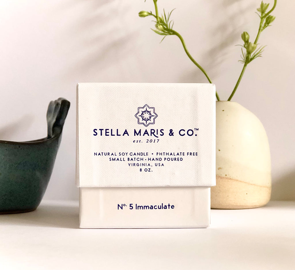 The Virgin Mary, from the first moment of her conception, was immaculate--no stain of sin ever touched her soul--and a model of what God intended for humanity at creation. In honor of her other-worldly purity, we have created the No. 5 Immaculate candle. The intoxicating scent carries notes of salt water, a reminder of God’s perfect creativity, and sweet myrtle, a flower that has long represented Mary’s purity and virginity.